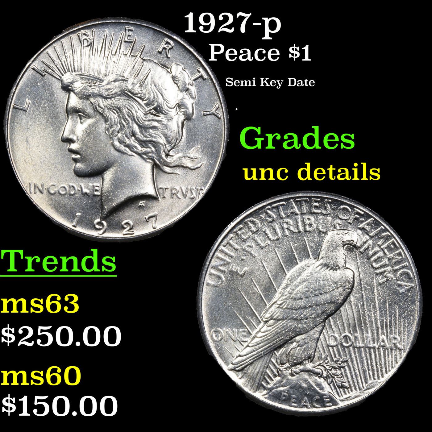 1927-p Peace Dollar $1 Grades Unc Details. The 27-p is the big sleeper of numismatics in my opinion. It has the 2nd lowest mintage in the whole Peace dollar series. Lower than the 34-s, the 21-p, yet it does not command its proper value. Good coin to own multiple of and save, in my opinion, but if you've been coming to our auctions for a while you will have seen that this has always been my opinion.