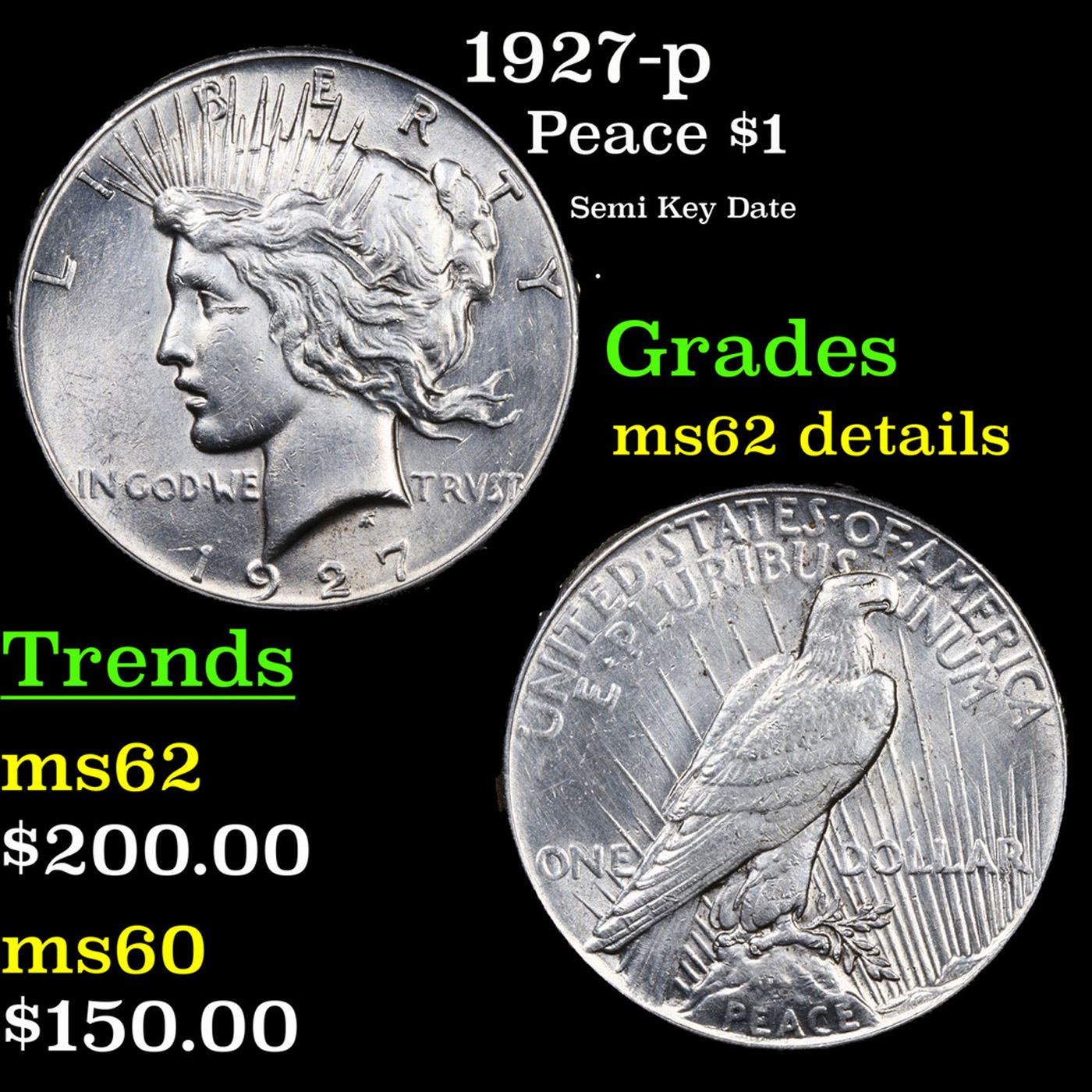 1927-p Peace Dollar $1 Grades Unc Details. The 27-p is the big sleeper of numismatics in my opinion. It has the 2nd lowest mintage in the whole Peace dollar series. Lower than the 34-s, the 21-p, yet it does not command its proper value. Good coin to own multiple of and save, in my opinion, but if you've been coming to our auctions for a while you will have seen that this has always been my opinion.