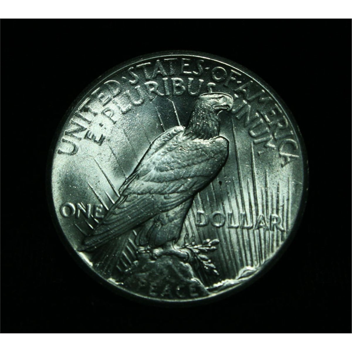 Nice white example. Good luster. Also the 1927-p is one of the greatest sleepers in all numismatics, as it is the 2nd lowest minted Peace dollar in the entire series. It has a lower mintage than the 34-s, the 24-s or the 21-p, yet it currently does not command its appropriate price. Coin World's Coin Values lists ms63 at $200 and The Wholesale Greysheet lists ms63 at $150. Estimated Value $160