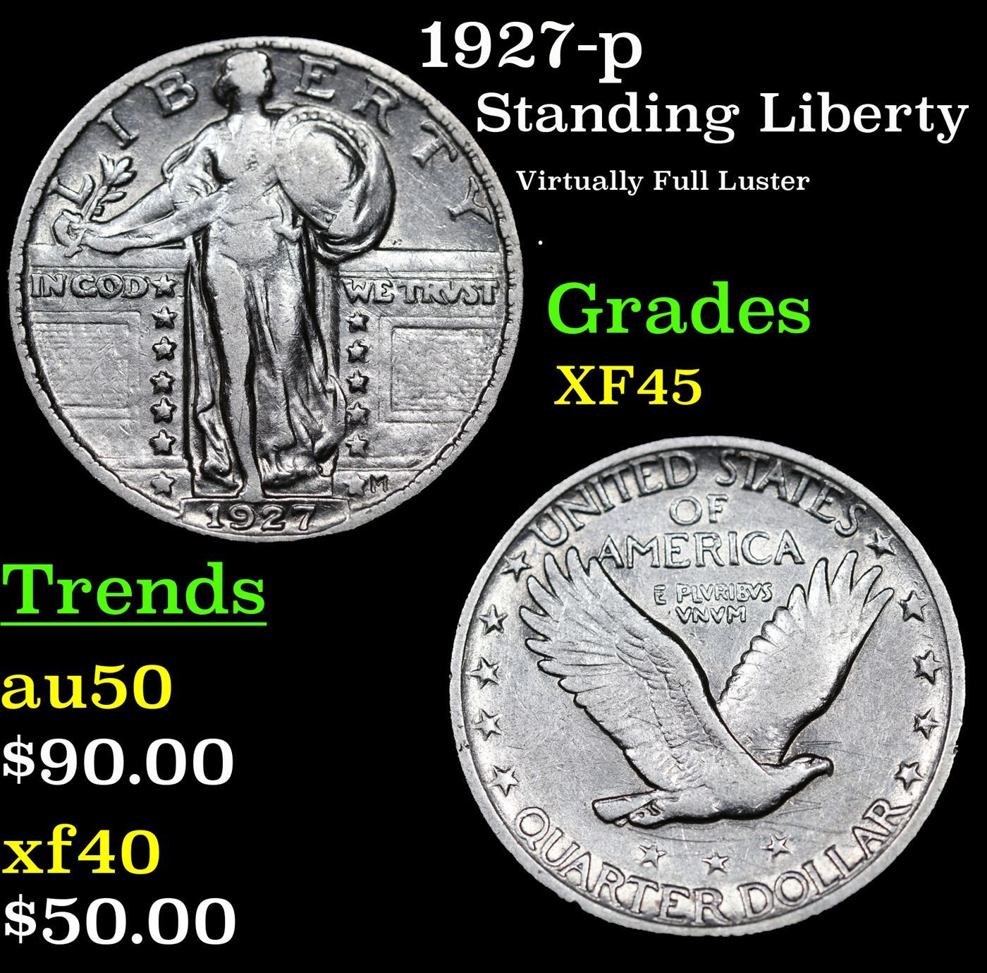 1927-p Standing Liberty Quarter 25c Grades xf+.