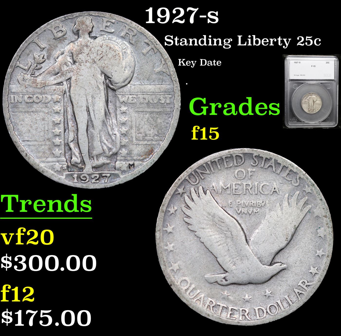 1927-s Standing Liberty Quarter 25c Graded f15 By SEGS.