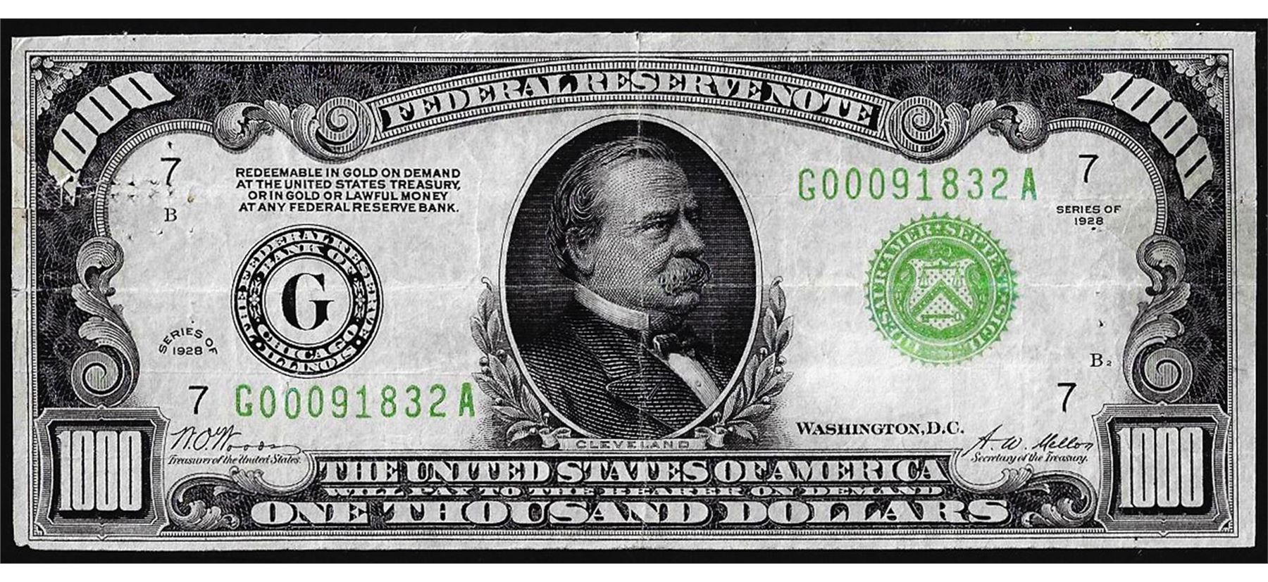 One 1928 $1,000 Federal Reserve Note Chicago Pinholes Repaired.