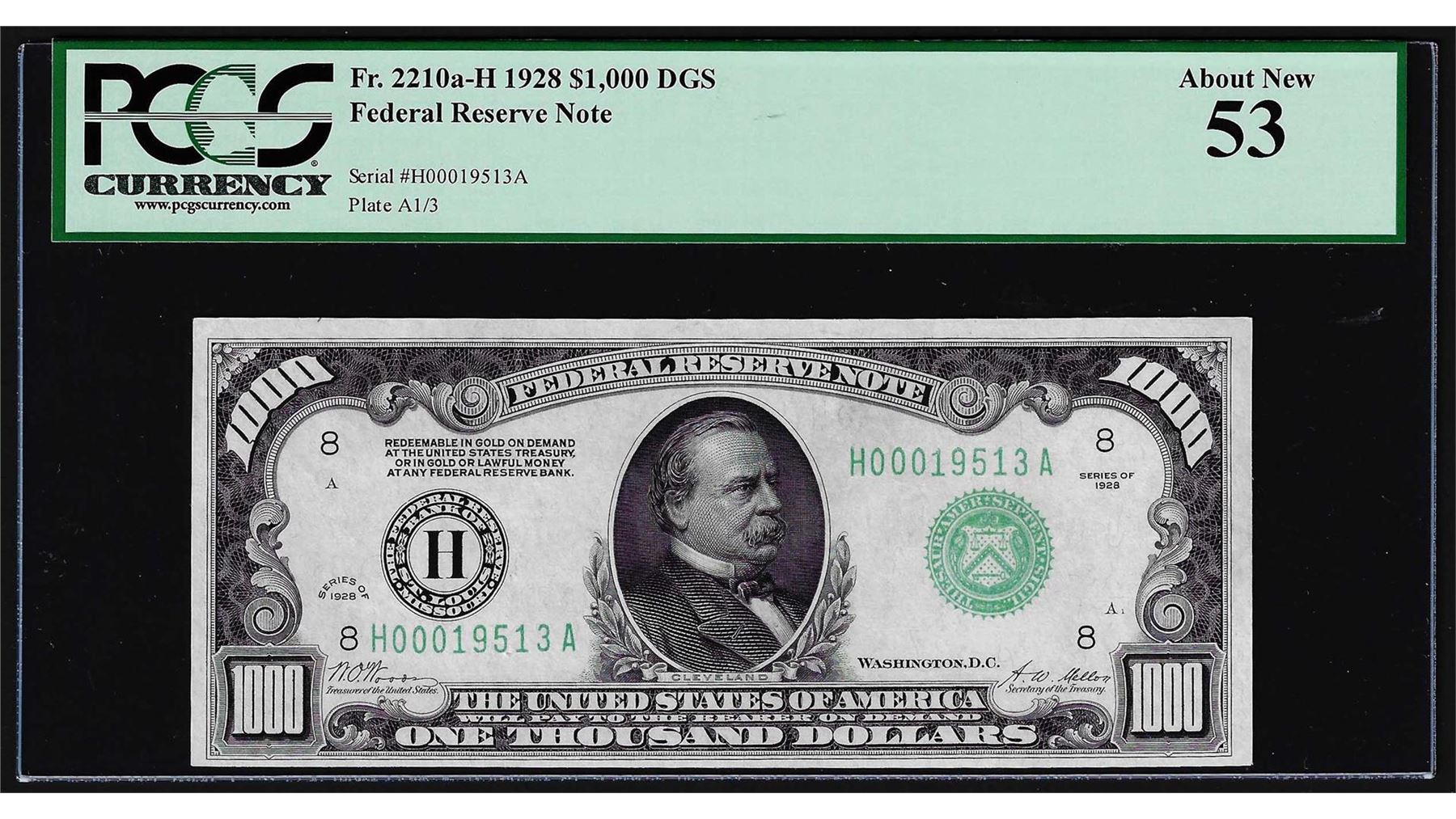 One 1928 $1,000 Federal Reserve Note Fr. 2210a-H PCGS About New 55. PCGS Graded.