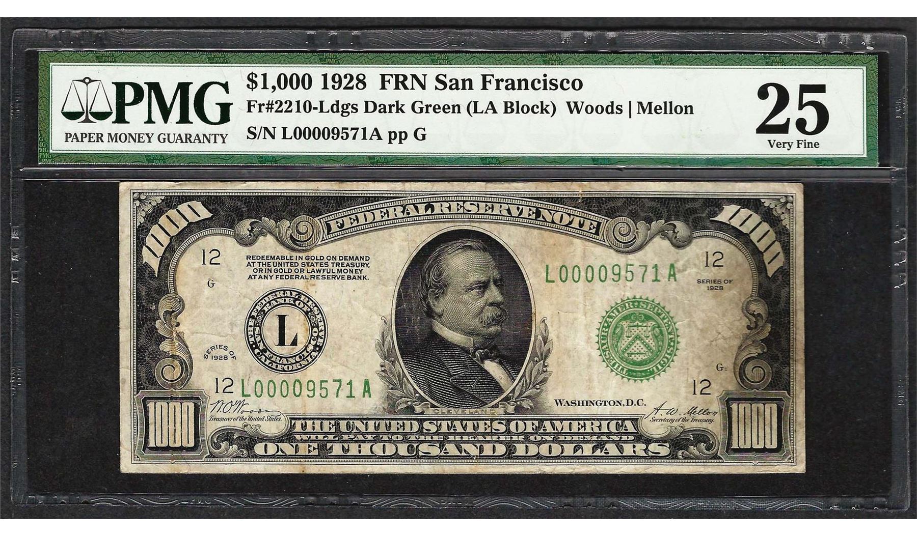 One 1928 $1,000 Federal Reserve Note San Francisco Fr.2210-L PMG Very Fine 25. PMG Certified.