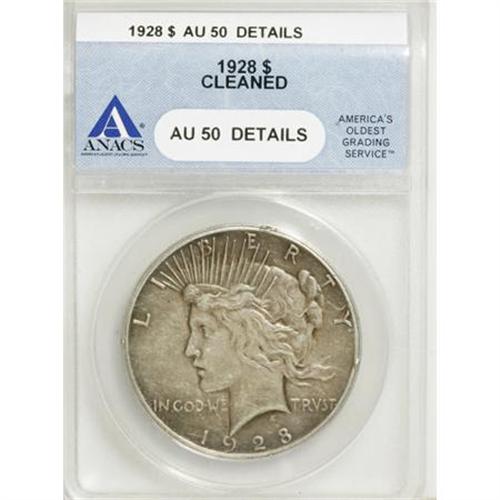 <B>1928 $1 --Cleaned--ANACS. AU50 Details.</B></I> NGC Census: (23/3718). PCGS Population (78/5749). Mintage: 360,649. Numismedia Wsl. Price for NGC/PCGS coin in AU50: $396. (#7373)<BR><BR><B>Coin Engraver:</B> Anthony de Francisci<BR><BR><b>Shipping:</b> Coins & Currency (<a target="_blank" href="http://www.heritageauctions.com/common/shipping.php">view shipping information</a>)