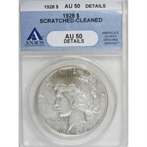 <B>1928 $1 --Cleaned, Scratched--ANACS. AU50 Details.</B></I> NGC Census: (23/3734). PCGS Population (78/5774). Mintage: 360,649. Numismedia Wsl. Price for NGC/PCGS coin in AU50: $396. (#7373)<BR><BR><B>Coin Engraver:</B> Anthony de Francisci<BR><BR><b>Shipping:</b> Coins & Currency (<a target="_blank" href="http://www.heritageauctions.com/common/shipping.php">view shipping information</a>)