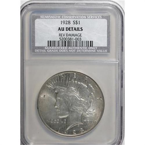 <B>1928 $1 --Reverse Damaged--NCS. AU Details.</B></I> NGC Census: (0/0). PCGS Population (0/0). Mintage: 360,649. (#7373)<BR><BR><B>Coin Engraver:</B> Anthony de Francisci<BR><BR><b>Shipping:</b> Coins & Currency (<a target="_blank" href="http://www.heritageauctions.com/common/shipping.php">view shipping information</a>)