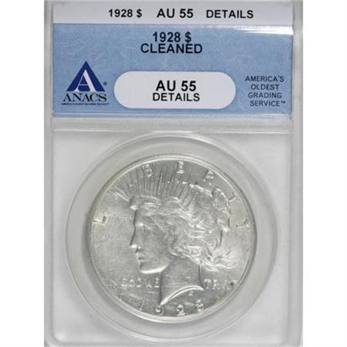 <B>1928 $1 --Cleaned--ANACS. AU55 Details.</B></I> NGC Census: (131/3569). PCGS Population (286/5425). Mintage: 360,649. Numismedia Wsl. Price for NGC/PCGS coin in AU55: $417. (#7373)<BR><BR><B>Coin Engraver:</B> Anthony de Francisci<BR><BR><b>Shipping:</b> Coins & Currency (<a target="_blank" href="http://www.heritageauctions.com/common/shipping.php">view shipping information</a>)