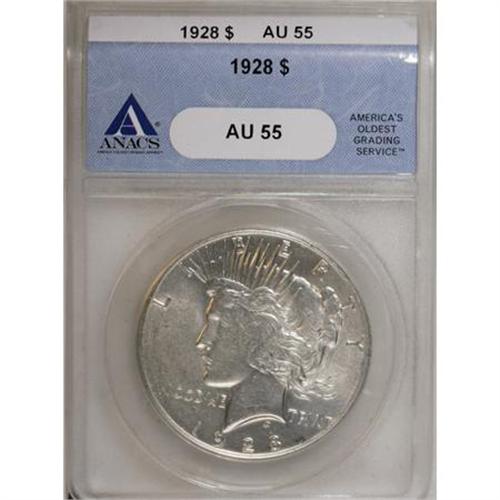 <B>1928 $1 AU55 ANACS.</B></I> . NGC Census: (132/3625). PCGS Population (290/5498). Mintage: 360,649. Numismedia Wsl. Price for NGC/PCGS coin in AU55: $417. (#7373)<BR><BR><B>Coin Engraver:</B> Anthony de Francisci<BR><BR><b>Shipping:</b> Coins & Currency (<a target="_blank" href="http://www.heritageauctions.com/common/shipping.php">view shipping information</a>)
