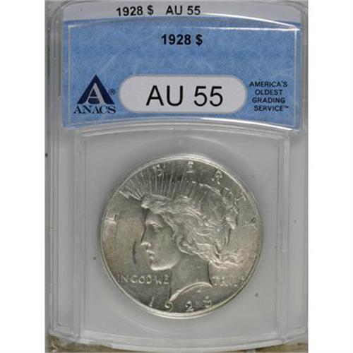 <B>1928 $1 AU55 ANACS.</B></I> NGC Census: (132/3632). PCGS Population (291/5506). Mintage: 360,649. Numismedia Wsl. Price for NGC/PCGS coin in AU55: $417. (#7373)<BR><BR><B>Coin Engraver:</B> Anthony de Francisci<BR><BR><b>Shipping:</b> Coins & Currency (<a target="_blank" href="http://www.heritageauctions.com/common/shipping.php">view shipping information</a>)