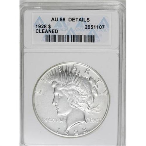 <B>1928 $1 --Cleaned--ANACS. AU58 Details.</B></I> NGC Census: (425/3131). PCGS Population (598/4797). Mintage: 360,649. Numismedia Wsl. Price for NGC/PCGS coin in AU58: $425. (#7373)<BR><BR><B>Coin Engraver:</B> Anthony de Francisci<BR><BR><b>Shipping:</b> Coins & Currency (<a target="_blank" href="http://www.heritageauctions.com/common/shipping.php">view shipping information</a>)