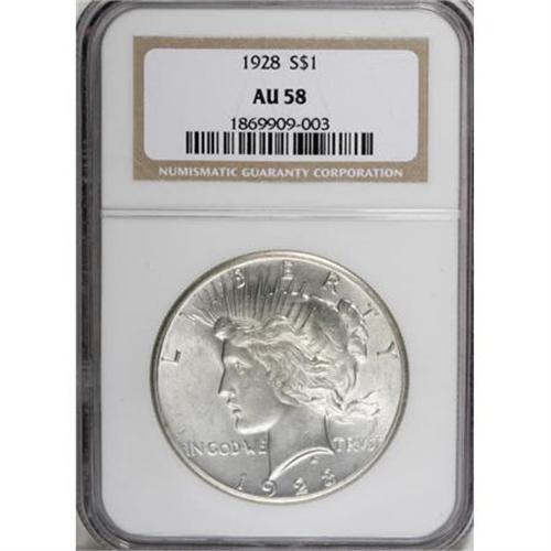 <B>1928 $1 AU58 NGC.</B></I> NGC Census: (402/3088). PCGS Population (591/4766). Mintage: 360,649. Numismedia Wsl. Price for NGC/PCGS coin in AU58: $425. (#7373)<BR><BR><B>Coin Engraver:</B> Anthony de Francisci<BR><BR><b>Shipping:</b> Coins & Currency (<a target="_blank" href="http://www.heritageauctions.com/common/shipping.php">view shipping information</a>)