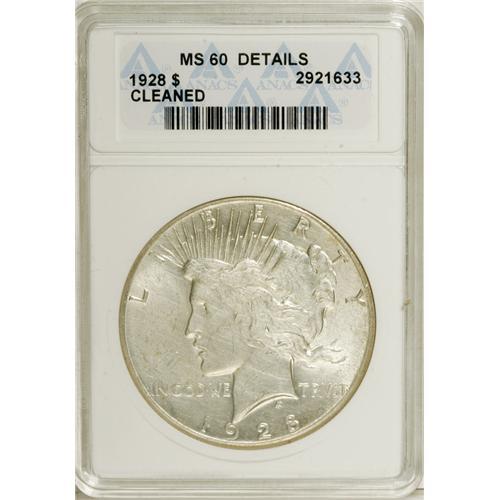 <B>1928 $1 --Cleaned--ANACS. MS60 Details.</B></I> NGC Census: (50/2919). PCGS Population (76/4566). Mintage: 360,649. Numismedia Wsl. Price: $460. (#7373)<BR><BR><b>Shipping:</b> Coins & Currency (<a target="_blank" href="http://www.heritageauctions.com/common/shipping.php">view shipping information</a>)