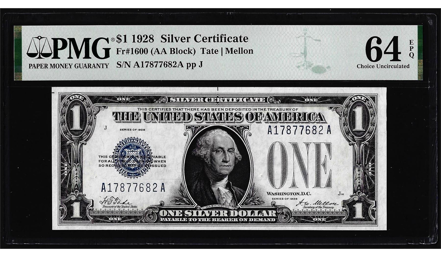 One 1928 $1 Funnyback Silver Certificate Note Fr.1600 PMG Choice Uncirculated 64EPQ. PMG Certified.