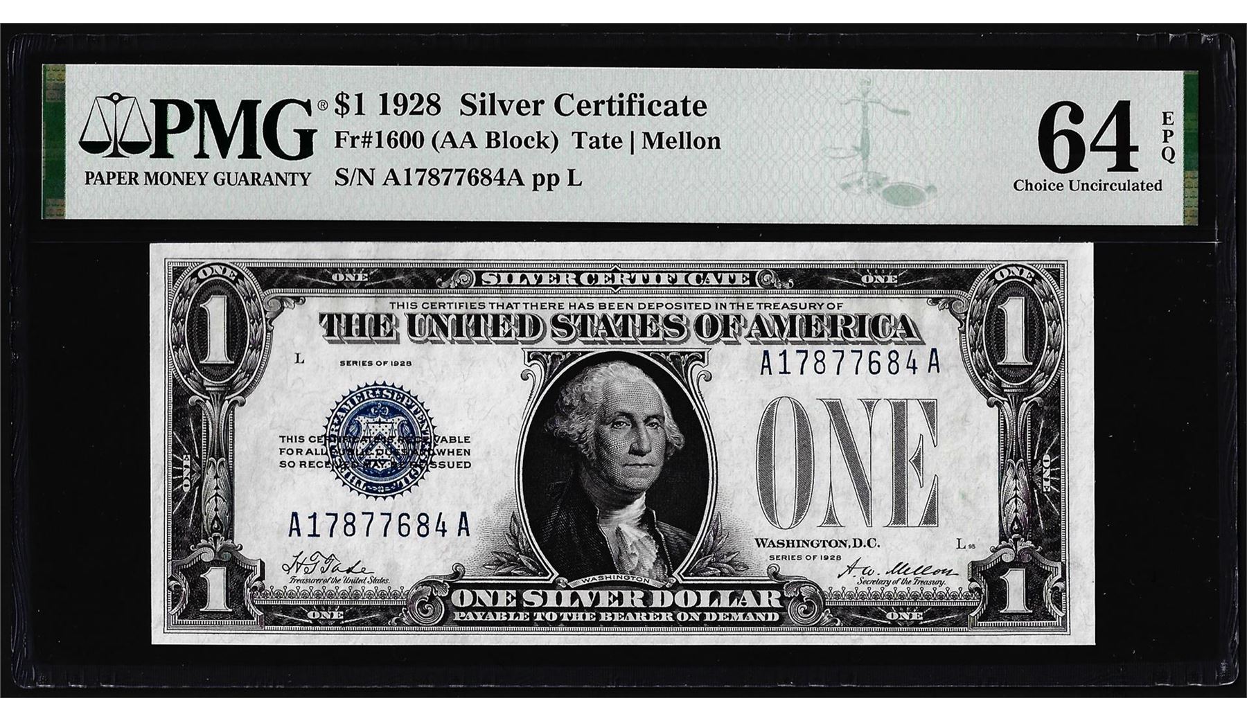 One 1928 $1 Funnyback Silver Certificate Note Fr.1600 PMG Choice Uncirculated 64EPQ. PMG Certified.