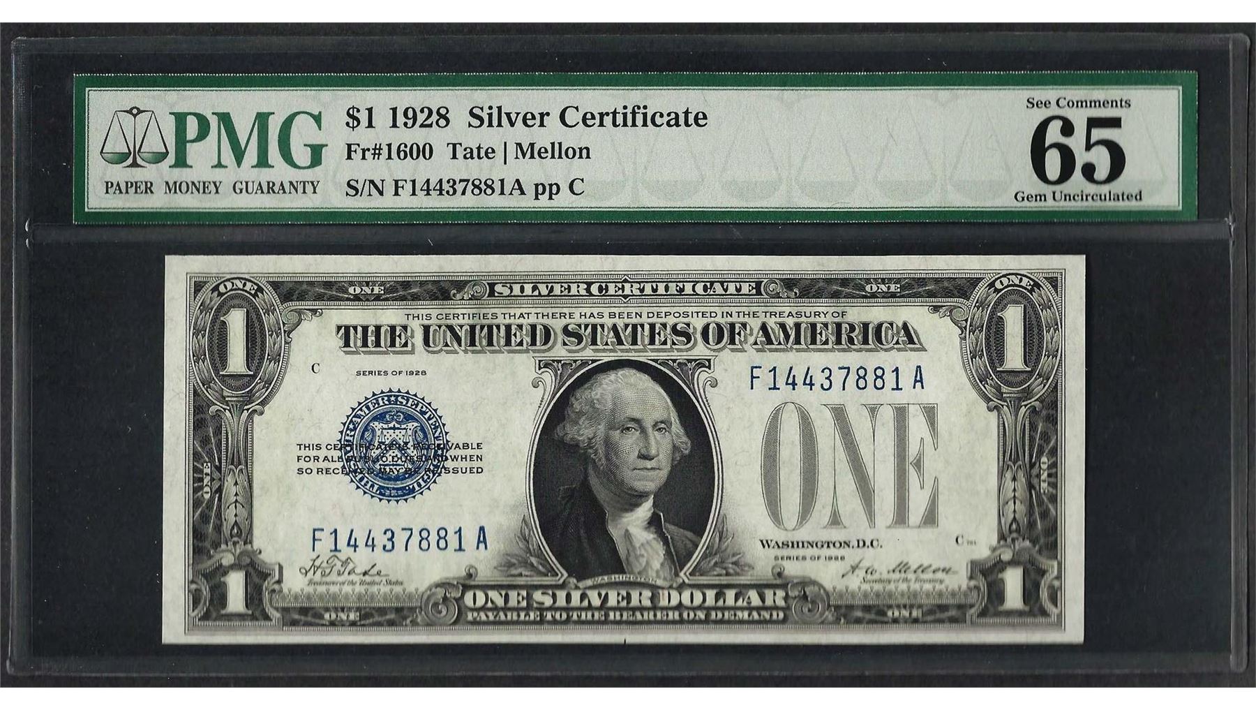 One 1928 $1 Funnyback Silver Certificate Note Fr.1600 PMG Gem Uncirculated 65EPQ. PMG Certified.