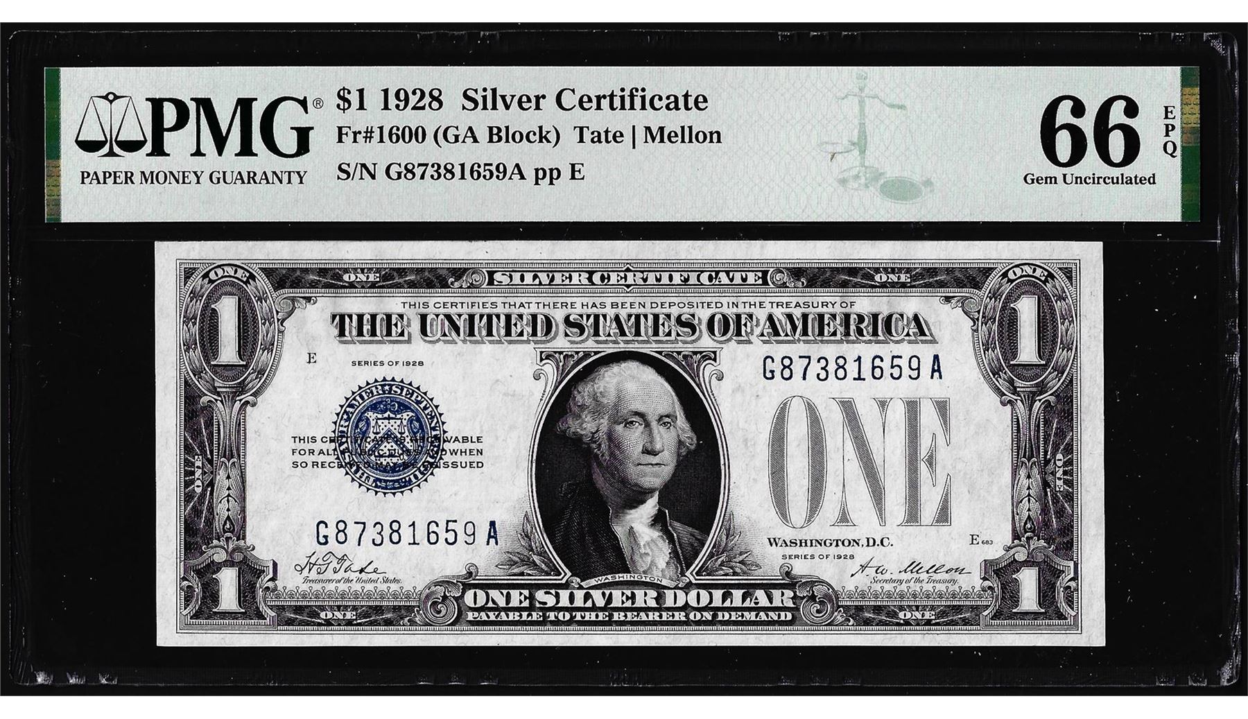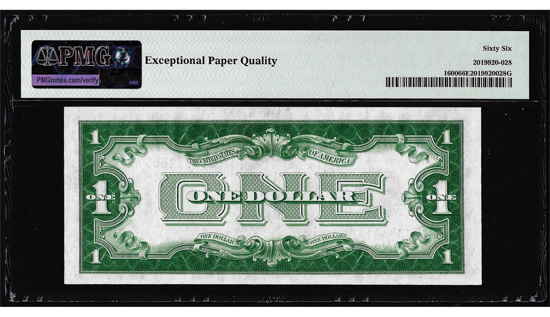 One 1928 $1 Funnyback Silver Certificate Note Fr.1600 PMG Gem Uncirculated 66EPQ. PMG Certified.
