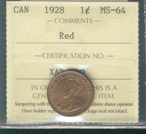 1928 1¢ ICCS MS64RD. Lustrous 85% red and lustrous.