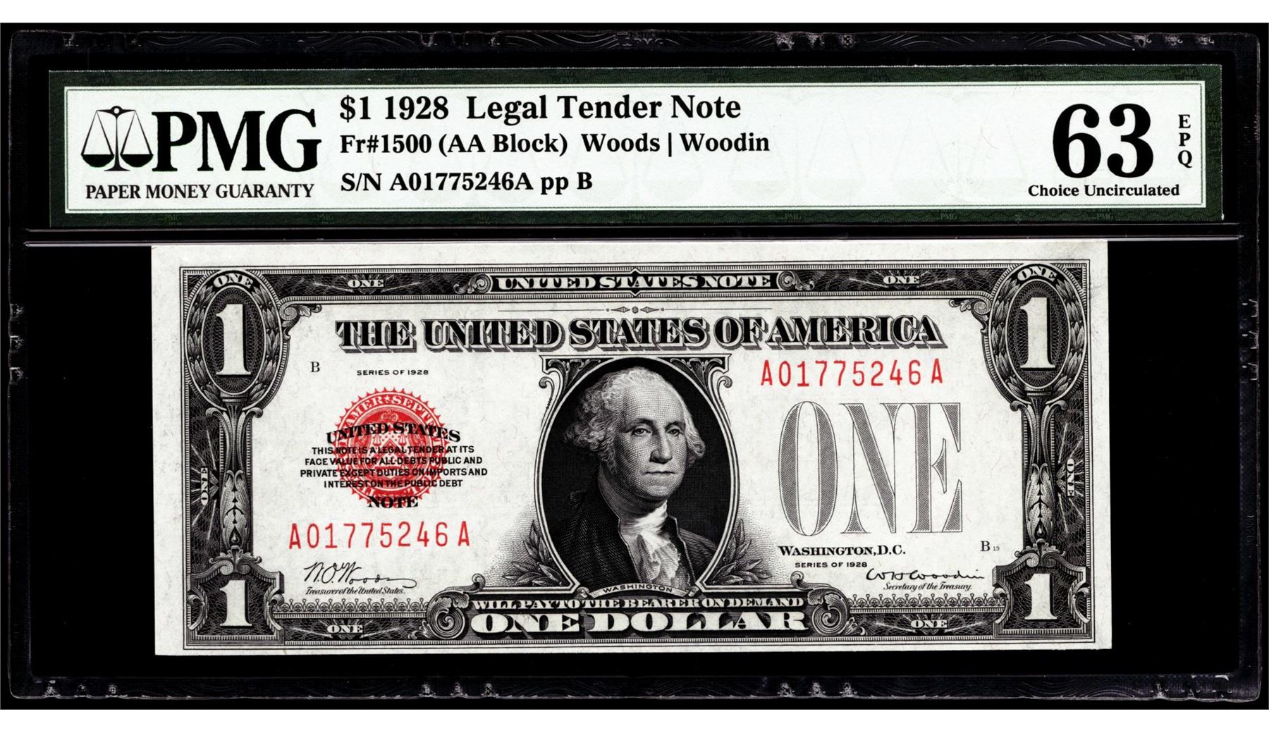 One 1928 $1 Legal Tender Note Fr.1500 PMG Choice Uncirculated 63EPQ. PMG Certified.