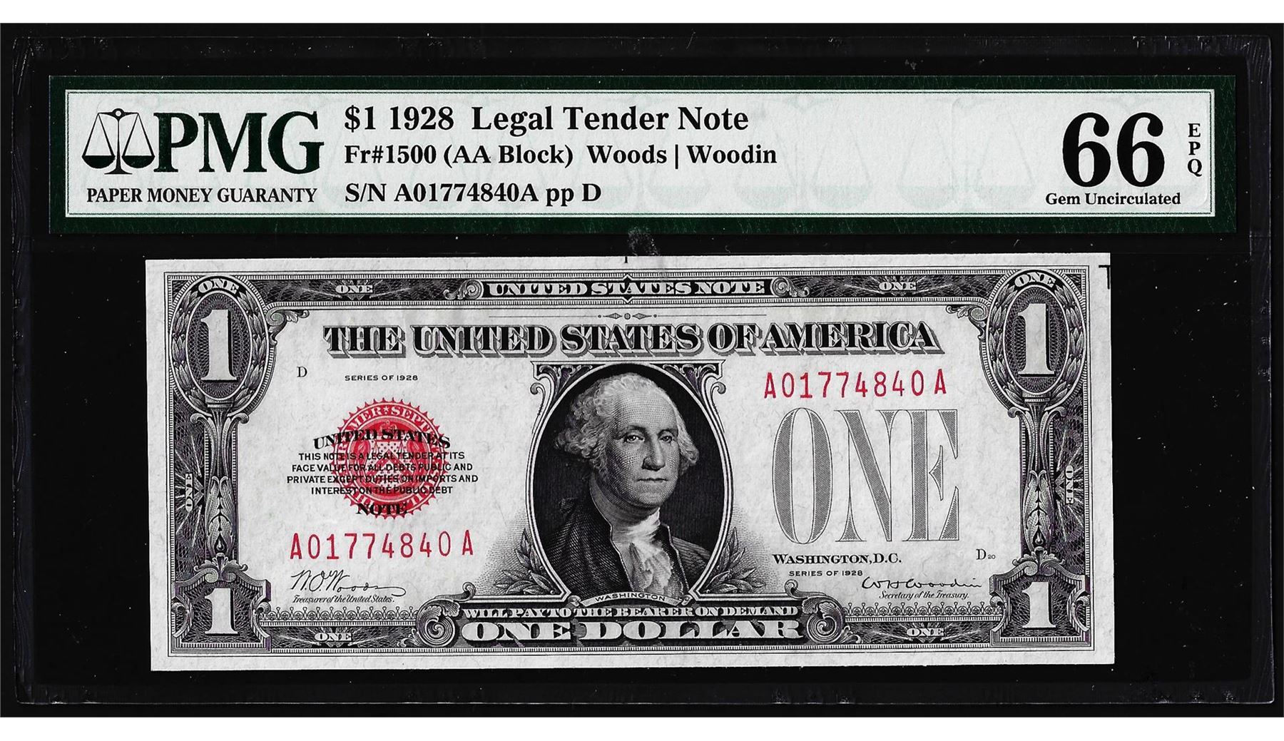 One 1928 $1 Legal Tender Note Fr.1500 PMG Gem Uncirculated 66EPQ. PMG Certified.