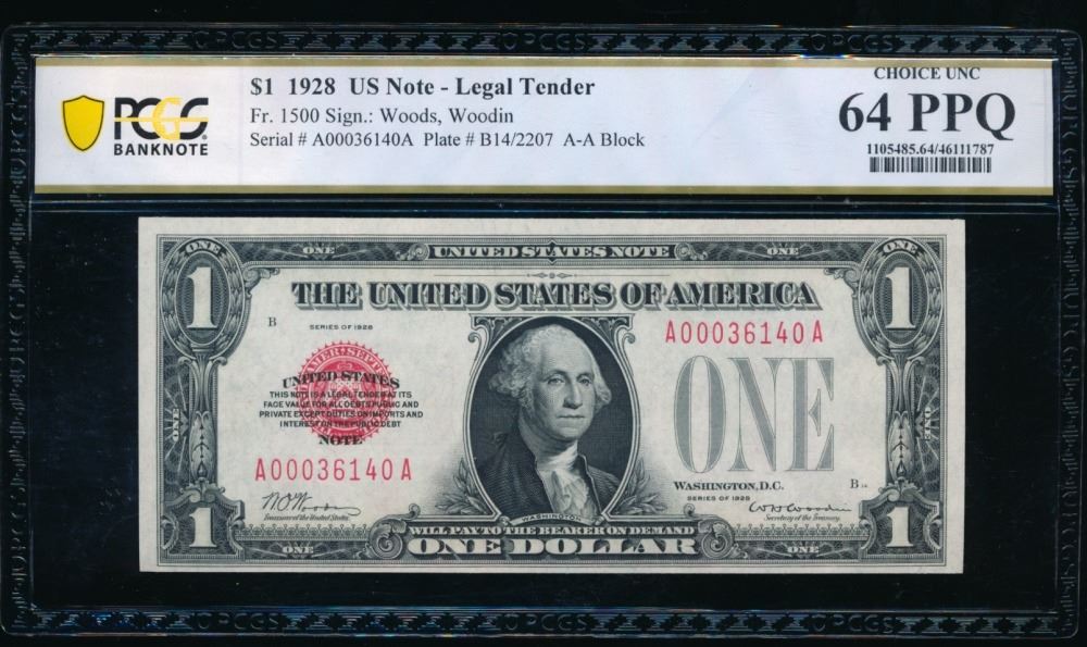 One 1928 $1 Legal Tender Note PCGS 64PPQ.
