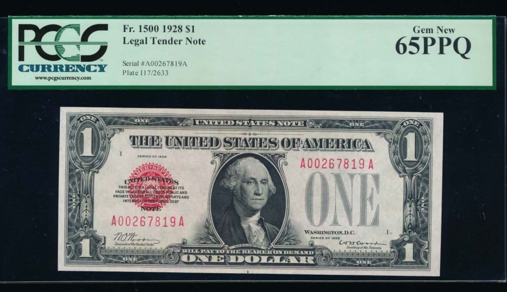 One 1928 $1 Legal Tender Note PCGS 65PPQ.