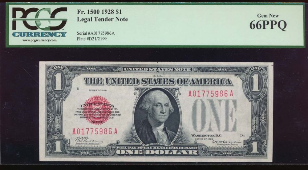 One 1928 $1 Legal Tender Note PCGS 66PPQ.