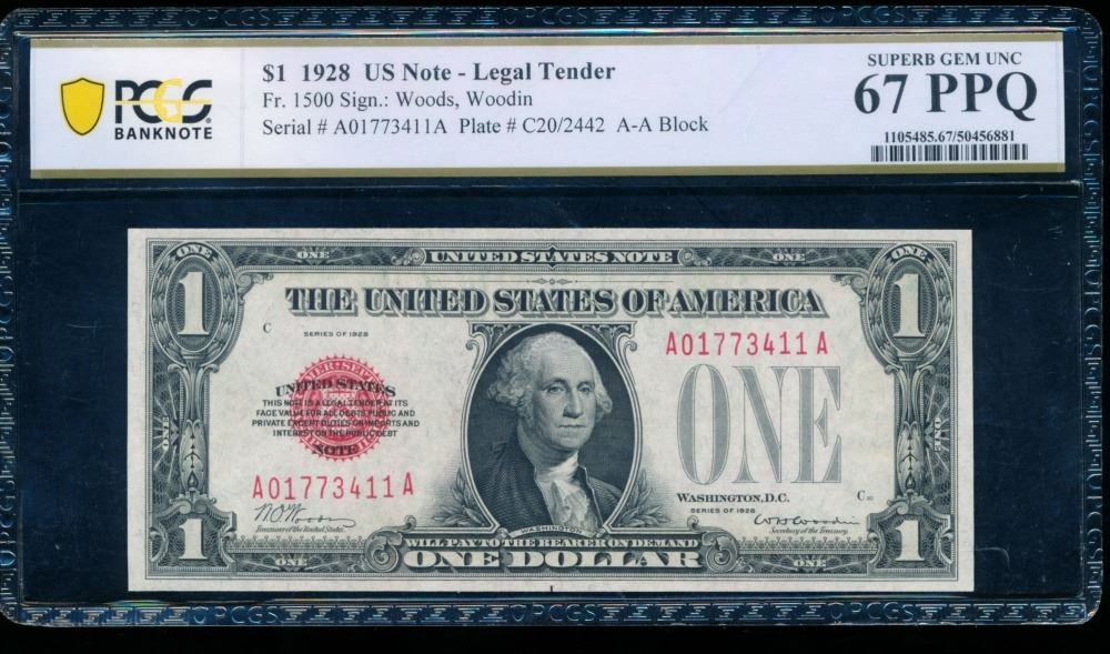 One 1928 $1 Legal Tender Note PCGS 67PPQ.