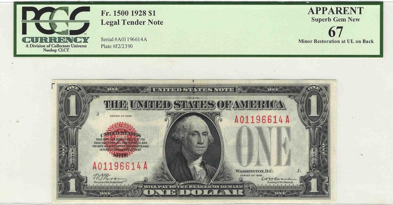 1928 $1 Red Seal Legal Tender Note -- Fr. 1500 -- PCGS Graded 67