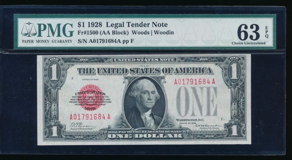 One 1928 $1 Legal Tender Note PMG 63EPQ.
