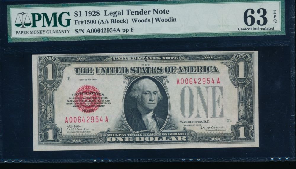 One 1928 $1 Legal Tender Note PMG 63EPQ.