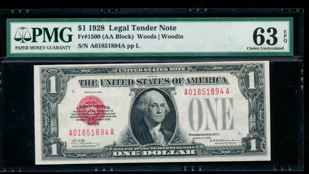 One 1928 $1 Legal Tender Note PMG 63EPQ.