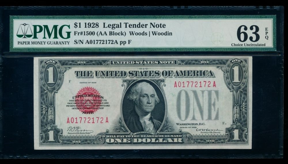 One 1928 $1 Legal Tender Note PMG 63EPQ.