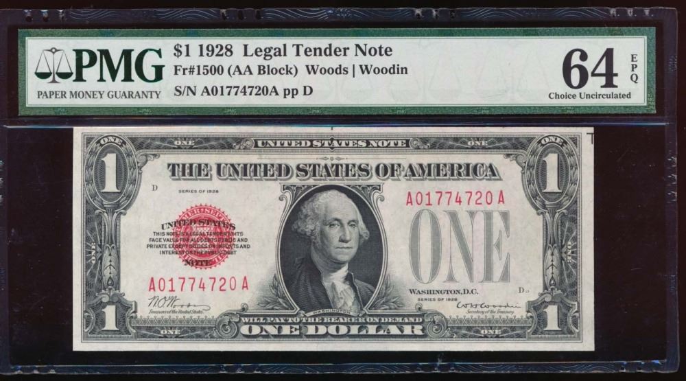 One 1928 $1 Legal Tender Note PMG 64EPQ.