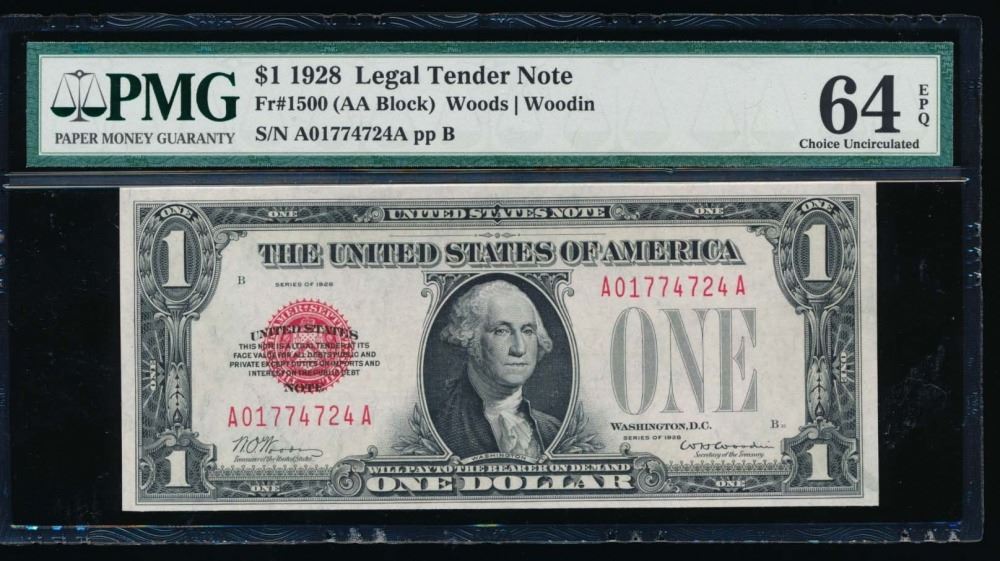 One 1928 $1 Legal Tender Note PMG 64EPQ.