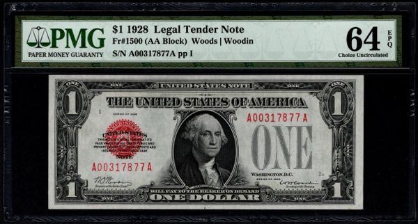One 1928 $1 Legal Tender Note PMG 64EPQ.