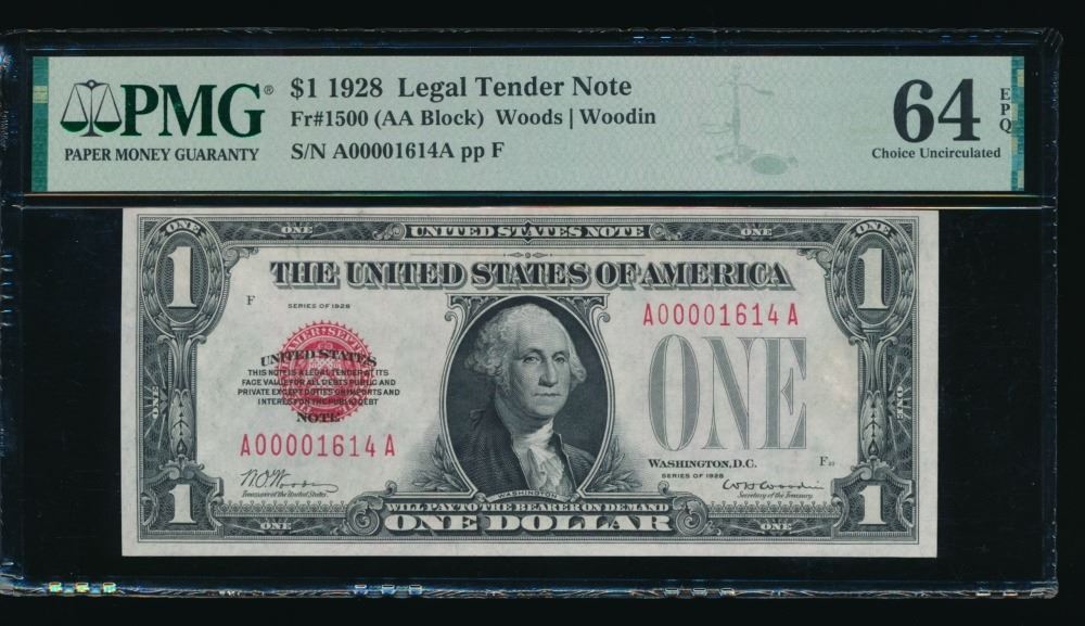 One 1928 $1 Legal Tender Note PMG 64EPQ.