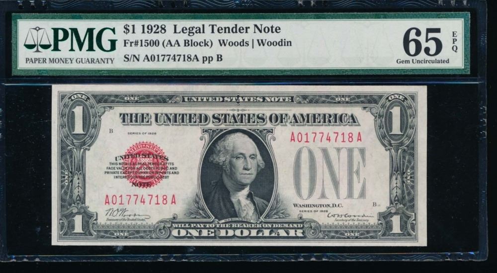 One 1928 $1 Legal Tender Note PMG 65EPQ.