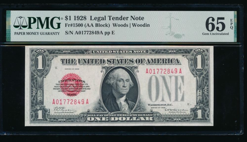 One 1928 $1 Legal Tender Note PMG 65EPQ.