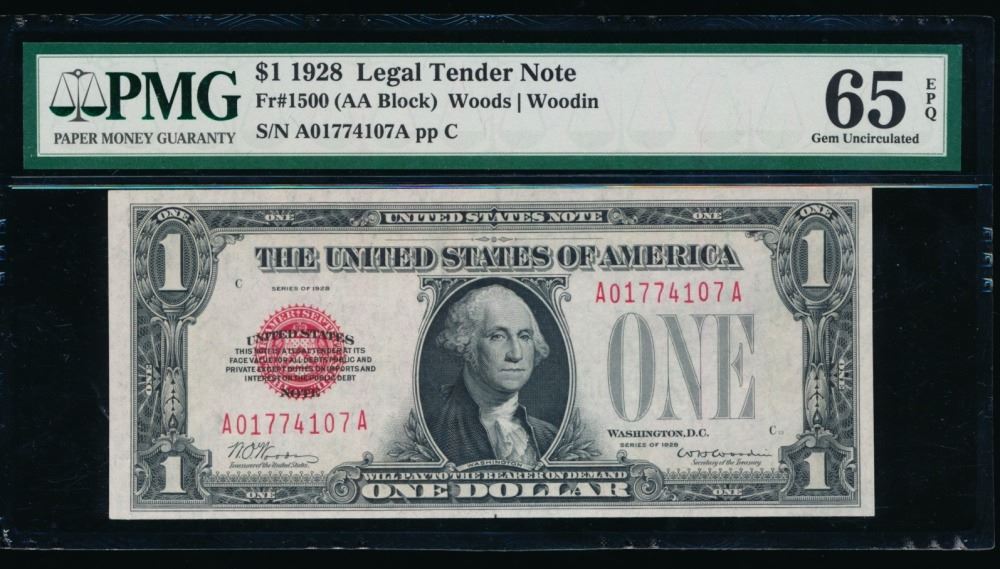 One 1928 $1 Legal Tender Note PMG 65EPQ.