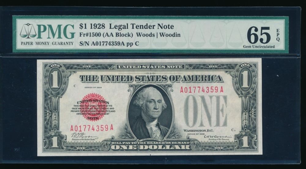One 1928 $1 Legal Tender Note PMG 65EPQ.