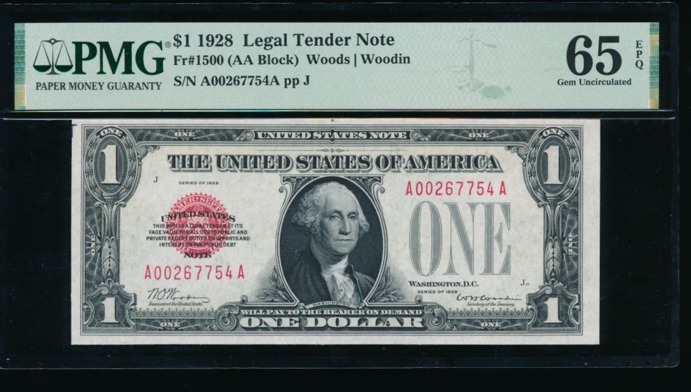 One 1928 $1 Legal Tender Note PMG 65EPQ.