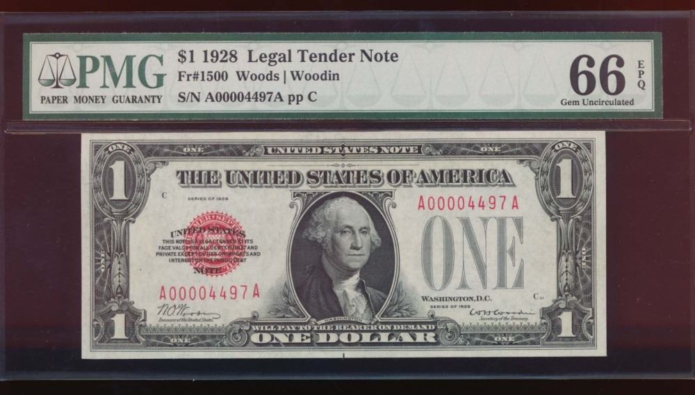 One 1928 $1 Legal Tender Note PMG 66EPQ.