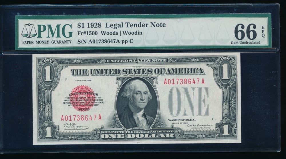 One 1928 $1 Legal Tender Note PMG 66EPQ.