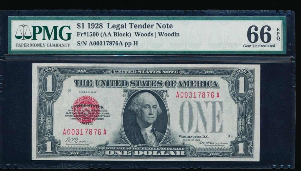 One 1928 $1 Legal Tender Note PMG 66EPQ.