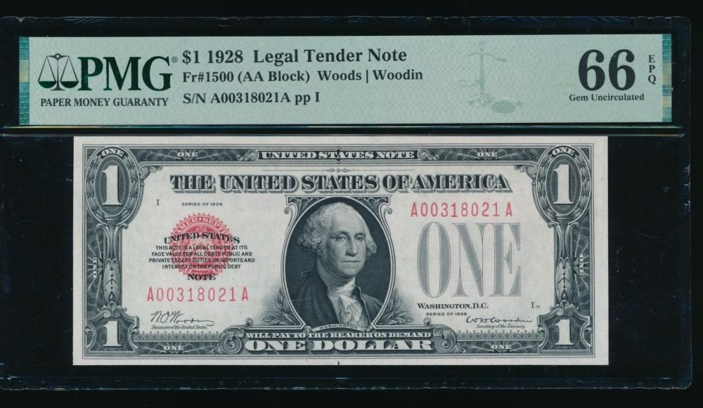 One 1928 $1 Legal Tender Note PMG 66EPQ.