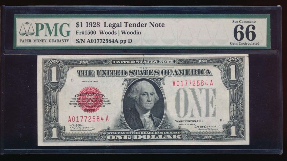One 1928 $1 Legal Tender Note PMG 66.