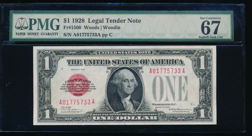 One 1928 $1 Legal Tender Note PMG 67EPQ.