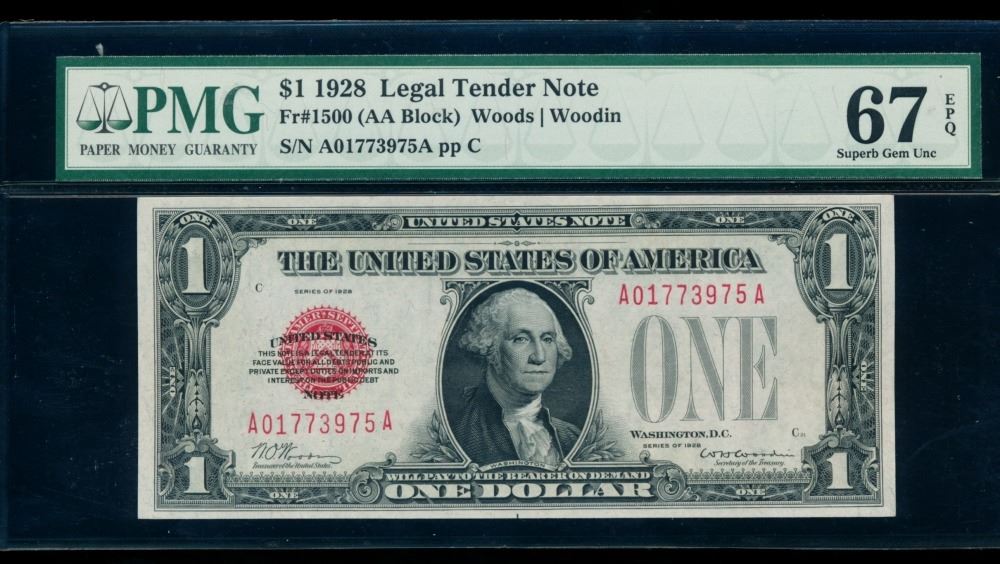 One 1928 $1 Legal Tender Note PMG 67EPQ.