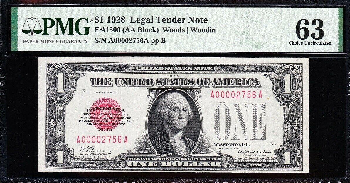 One 1928 $1 Low Serial Legal Tender PMG 63.